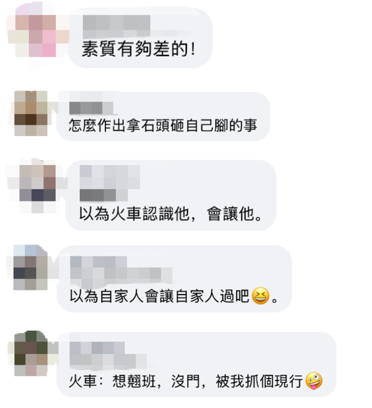 有网友批评说“素质够差的”“怎么做出拿石头砸自己脚的事”。还有网友调侃说,“以为火车认识他,会让他”“以为自家人会让自家人过吧”“火车:想翘班,没门,被我抓个现行”。